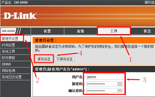 2、点击“工具”——>“管理员设置”——>“用户名”建议用户修改——>“新密码”建议用户设置字母、数字、大小写的组合——>“确认密码”输入新密码栏输入过的密码——>点击上方的“保存设定”。